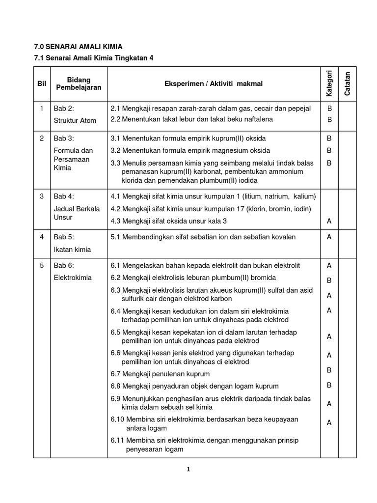 RPT AMALI KIMIA T4 2016 RANCANGAN TAHUNAN AMALI KIMIA TINGKATAN 4 BIL 1 BULAN JAN BAB SENARAI AKTIVITIEKSPERIMEN BERDASARKAN BUKU TEKS AMALI TINGKATAN 4 Struktur Atom 2 3 4. 1108 Templat Pelaporan KSSM MPEI Tingkatan 5 Sains Rumah Tanggaxlsx. View Text Version Category.