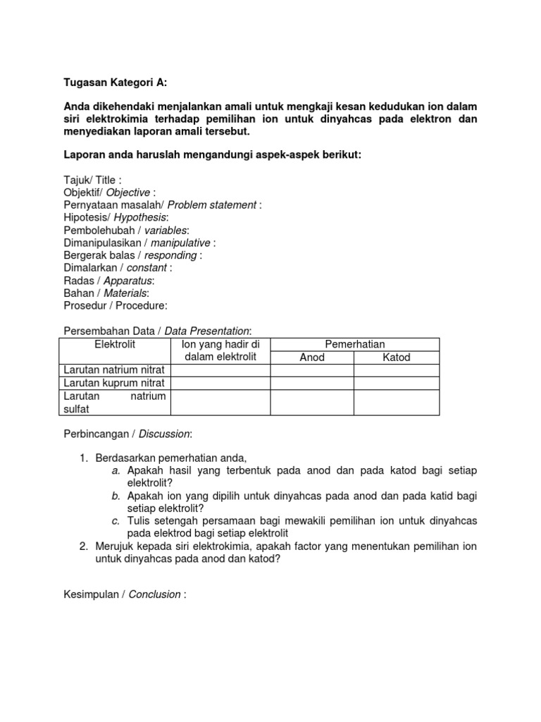 A Anod b Katod c Elektrolisis 3. TEMA BIDANG TAJUK EKSPERIMEN PEMBELAJARAN 9 PROSES KIMIA 90 Keseimbangan 962 Menjalankan eksperimen untuk mengkaji kesan logam lain yang bersentuhan redoks dengan besi terhadap pengaratan besi. Laporan eksperimen kimia tingkatan 4Kimia tingkatan 5 bab 4 lky 4 contoh.